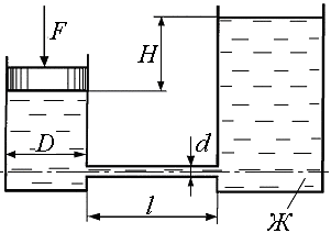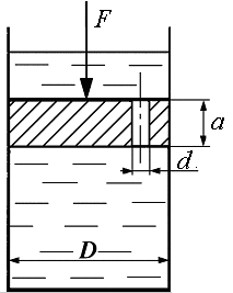 13. На поршень диаметром D действует сила F (рис. 1.11). Определить скорость движения поршня, если в цилиндре находится вода, диаметр отверстия в поршне d, толщина поршня а. Силой трения поршня о цилиндр пренебречь, давление жидкости на верхнюю плоскость поршня не учитывать.