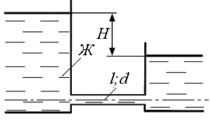 14. Определить длину трубы l, при которой расход жидкости из бака будет в два раза меньше, чем через отверстие того же диаметра d. Напор над отверстием равен Н. Коэффициент гидравлического трения в трубе принять l = 0,025 (рис. 1.12).