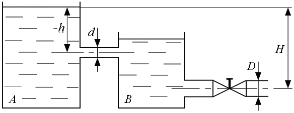 17. Из бака А, в котором поддерживается постоянный уровень, вода протекает по цилиндрическому насадку диаметром d в бак В, из которого сливается в атмосферу по короткой трубе диаметром D, снабженной краном (рис. 1.13). Определить наибольшее значение коэффициента сопротивления крана x, при котором истечение из насадка будет осуществляться в атмосферу. Потери на трение в трубе не учитывать.