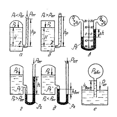 пьезометры открытого (а) и закрытого (б) типа; дифманометр (в);