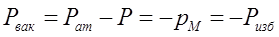 При определении гидростатического давления, как правило, оперируют абсолютным (полным) давлением Р, манометрическим (избыточным) давлением РM и вакуумом РV (отрицательным избыточным давлением). Между этими величинами существуют следующие зависимости: