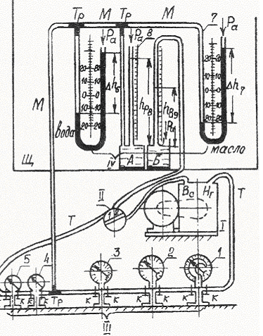 Группа жидкостных приборов IV смонтирована на щите III. Она состоит из двух U-образных манометров (одно колено сообщается с атмосферой) и двух пьезометров: