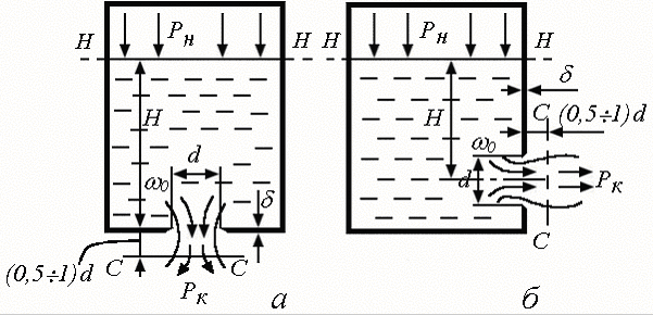 Если линейный размер d отверстия значительно больше толщины стенки d, в которой оно сделано (d > 3d), то такое отверстие называется отверстием в тонкой стенке. При этом считается, что края отверстия имеют острую кромку и при прохождении жидкости через такие отверстия практически отсутствуют потери напора на трение.
