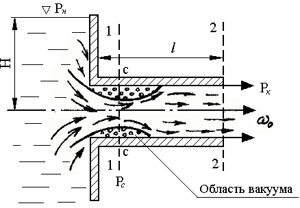 Цилиндрические, конические сходящиеся и коноидальные насадки способствуют увеличению расхода вытекающей жидкости, по сравнению с истечением из отверстия. Это объясняется тем, что при входе в насадок происходит сжатие струи, а затем постепенное ее расширение с заполнением всего сечения насадка. Вследствие сжатия струи в насадке образуется вакуум, при этом возрастает действующий напор, т.к. истечение происходит не в атмосферу, а в область вакуума (рис.8.3).