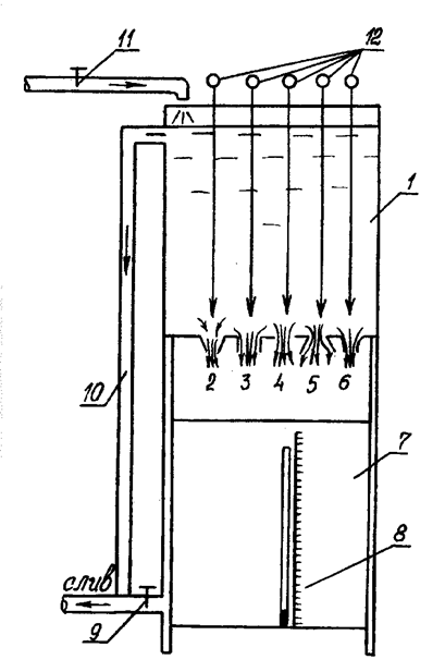 Лабораторная установка (рис. 8.4) состоит из напорного бака, в дне которого выполнено отверстие 4 диаметром 12,5 мм и смонтированы 4 насадка: конический сходящийся 2, внешний цилиндрический 3, конический расходящийся 5 и коноидальный 6. Нижняя часть установки представляет собой мерный бак 7, оборудованный водомерным стеклом 8. Для открытия и закрытия насадков и отверстия служат металлические стержни 12, верхний конец которых изогнут в виде кольца, а на нижнем закреплена резиновая пробка. Подача воды в напорный бак осуществляется через трубопровод 11. Слив жидкости из мерного бака по окончании опытов проводится через кран 9. Для поддержания постоянного уровня в напорном баке установка оборудована обводной трубой 10.