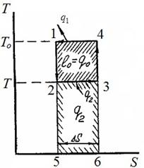 Холодильные установки (ХУ) служат для искусственного охлаждения тел ниже температуры окружающей среды. Рабочее тело в ХУ – воздух и жидкости с низкими температурами кипения: аммиак, углекислота, сернистый ангидрид и фреоны. ХУ работают по обратному циклу, в котором, в противоположность прямому циклу, затрачивается работа извне, теплота отнимается от охлаждаемых тел и подводится к рабочему телу. Идеальным циклом ХУ является обратный цикл Карно (рис. 12.1). В этом цикле работа l0 = q0 затрачивается, а теплота q2 = q1 – q0 переносится от холодного тела более нагретому. Отношение теплоты, отведенной от охлаждаемого тела q2 (холодопроизводительности), к затраченной работе l0 = q1 – q2 называется холодильным коэффициентом, обозначается εt и является характеристикой экономичности ХУ: