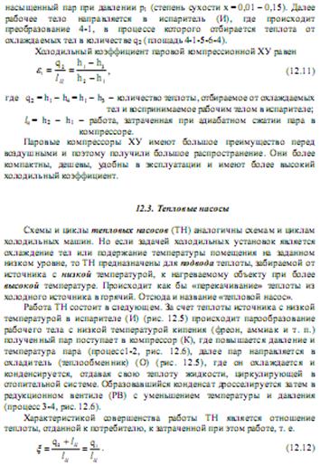 Схема воздушной ХУ приведена на рис.12.2, а цикл показан на рис. 12.3 и 12.4. в диаграммах p,υ и T,s. Воздушный компрессор (ВК) забирает воздух (рабочее тело) из холодильной камеры (ХК), сжимает его адиабатно и подает в охладитель (О) (процесс 1-2), где сжатый воздух изобарно охлаждается (процесс 2-3) с помощью циркулирующей воды до температуры Т3. Далее охлажденный воздух с давлением р2 адиабатно расширяется до первоначального давления р1 (процесс 3-4). При расширении температура воздуха падает до T4, которая может достигать –70 оС. Затем холодный воздух поступает в ХК, где, отбирая теплоту от охлаждаемых тел в количестве q2 (рис. 12.4), нагревается до первоначальной температуры Т1.