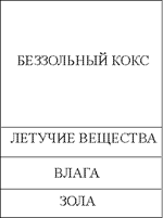 По техническому анализу в углях различают условную горючую массу, состоящую из летучих веществ и беззольного кокса, и балласт, куда входят влага и зола. Схема распределения составных частей угля при нагревании его без доступа воздуха показана на рис. 2.