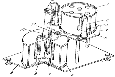 На печи установлена плита 4. На ней крепятся стойка для системы блоков и барабан 1, вращаемый электродвигателем через редуктор с окружной скоростью 13 мм/мин, и направляющая трубка 2, по которой перемещаются вертикально два груза. Один из них уравновешивает груз 5, другой груз уравновешивает штемпель 10, соединенный нитью через систему блоков с пером 8, установленным на грузе и записывающим кривую вспучивания испытуемого угольного брикета на миллиметровой бумаге, обернутой вокруг вращающегося барабана. Аппарат смонтирован на плите 9 и снабжен установочными винтами и уровнем 11 для регулирования горизонтального положения аппарата.
