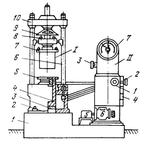 Рис. 40. Установка для изготовления и испытания образцов: I – пресс: 1 – фундамент; 2 – станина; 3 – цилиндр; 4 – плунжер; 5 и 7 – нижняя и верхняя опорная плита; 6 – колонна; 8 – ходовой винт; 9 – маховичек; 10 – поперечина; II – пульт управления: 1 и 2 – вентили регулятора скорости и сброса масла; 3 – маховичок переключения диапазона нагрузки; 4 – кнопочная панель насоса; 5 – электродвигатель; 6 – гидронасос с фильтром; 7 – силоизмеритель (манометр) |