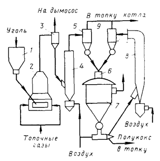 Рис. 53. Схема высокоскоростного пиролиза угля по методу ЭНИН: 1—бункер сырого угля; 2— размалывающее устройство; 3 — циклон для отделения сухой пыли; 4— реторта нагрева; 5 — циклон для отделения горячей пыли; 6 — камера смешения; 7—реактор-пиролизер; 8—технологическая топка; 9— циклон горячего теплоносителя