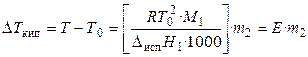 где М 1 — молярная масса растворителя, Dисп Н 1 — энтальпия испарения растворителя, m 2 — моляльность раствора (количество моль растворенного вещества в расчете на 1 кг растворителя); Е – эбулиоскопическая постоянная, равная повышению температуры кипения одномоляльного раствора по сравнению с температурой кипения чистого растворителя. Величина Е определяется свойствами только растворителя, но не растворенного вещества.