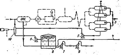 1 – линия сброса воды из отстойника; 2 – теплоизолированные отстойники для обезвоживания; 3 – коллектор для обезвоженной нефти; 4 – линия подачи сточной воды из электродегидратора; 5 – насос для подачи горячей пластовой воды, содержащей ПАВ в смеситель 10; 6 – насосы высокого давления, установленные на БКНС; 7 – насос для подачи воды на БКНС; 8 – резервуар-отстойник с гидрофобным фильтром; 9 – насос для подачи отстоявшейся нефти на повторную деэмульсацию; 10 – смеситель