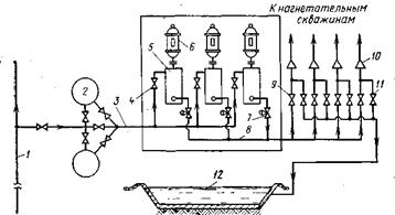 Для очистки ПЗ нагнетательных скважин, основанной на самоизливе и восстановлении их приемистости, закрывают задвижку 9 и открывает задвижку 11 и грязную воду сбрасывают в пруды-испарители 12.