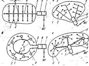 А – линейная; б – лучевая; в – кольцевая; г – групповая; 1 – скважина; 2 – шлейфы; 3 – отключающие задвижки; 4 – газосборный коллектор; 5 – контур газоносносности месторождения; 6 – промысловая газораспределительная станция (ПГРС); 7 – головные сооружения; 8 – групповые пункты сбора газа (ГПСГ); 9 – конденсатопровод; МГ – магистральный газопровод