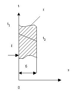 Дана однородная и изотропная стенка (рис.3) толщиной δ с постоянным коэффициентом теплопроводности λ, два других размера стенки неограниченны. На наружных поверхностях стенки поддерживают постоянные температуры t1 и t2. При заданных условиях температура будет изменяться только в направлении оси Ox, т.е. температурное поле будет одномерным и