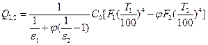 Чтобы воспользоваться уравнением (146), необходимо определить предварительно значение углового коэффициента φ. Это можно сделать, рассмотрев случай, когда Т1=Т2. При этом Q1,2=0, что выполняется при условии, если выражение в квадратных скобках (146) равно нулю. Этому соответствует F1=φF2 или φ= F1/F2. Тогда (146) перепишется так: