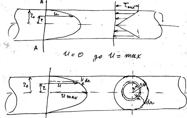 Рассмотрим установившееся движение при ламинарном режиме полагая, что начальное сечение потока находится на достаточном расстоянии от входа для обеспечения устойчивого распределения скорости в поперечном сечении.
