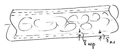 В турбулентном потоке происходит непрерывное перемешивание. Интенсивность его не одинакова по сечению трубы. Чем дальше от стенок, тем больше перемешивание. Часть потока занята турбулентным ядром и лишь у стенок образуется тонкий ламинарный слой или пленка.