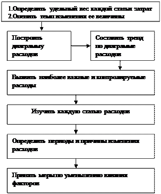 Данный процесс должен происходить по схеме (рисунок 14.7), представляющей процесс анализа структуры затрат. Целесообразно уделять внимание статистическим и динамическим характеристикам расходов: доле конкретной статьи расходов в общем объеме расходов на определенную дату и изменению доли конкретной статьи расходов в общем их объеме в течение анализируемого периода. Такой анализ обычно приводит к конкретному управленческому решению.