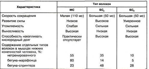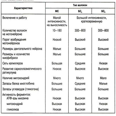 ДЕ дифференцируются по физиологическим и биохимическим характеристикам нейронов и мышечных волокон. Объективным критерием деятельности ДЕ является время сокращения. У человека оно колеблется от 20 до 120мс. К основным типам волокон относятся медленносокращающиеся (МС), или красные и б ыстросокращающиеся (БС), или белые (табл.1)