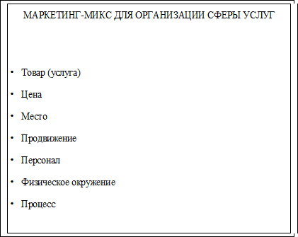 Семь «Р» - контролируемые организацией факторы маркетинга. Манипулирование этими факторами обеспечивает формирование конкурентоспособности организации. Товар (услуга) относится к разнообразию и полноте предоставляемых услуг. Ценовая политика предполагает составление прейскуранта, установление системы скидок и т.д. Элемент «место» относится с месторасположению и распределению услуг. К продвижению услуг относится реклама, паблик рилейшнз. Элемент «персонал» организации сферы услуг фокусируется на навыках и умениях работников различных уровней и категорий. Физическое окружение предполагает внешнюю привлекательность места предоставления услуги, внешний вид сотрудников, используемое оборудование. Процесс предоставления услуги отражает координацию всех факторов маркетинг-микса.