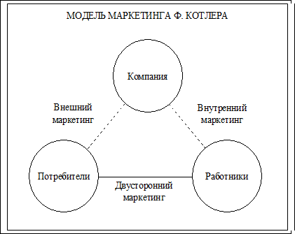 Внутренний (внутрикорпоративный) маркетинг- применение философии маркетинга к персоналу фирмы [3]. При этом персонал фирмы рассматривается как внутренний потребитель. Основная предпосылка внутреннего маркетинга заключается в том, что чем более удовлетворен персонал, тем более удовлетворены внешние потребители. В этой связи внутренний маркетинг неразрывно связан с управлением персоналом сервисной организации и формированием и поддержанием организационной культуры. При формировании маркетинговой системы в соответствии с треугольником Ф. Котлера внутренний маркетинг должен предшествовать внешнему маркетингу.