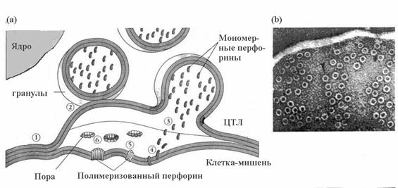 Р и с. 12-5. Экзоцитоз перфоринов Т-киллером и образованние поры в мембране клетки-мишени.