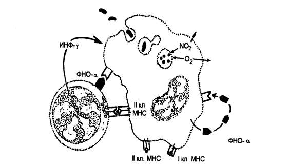 В результате распознавания иммуногенного комплекса на инфицированных макрофагах CD4+ Т-клетки воспаления активизируются, и экспрессируют на своей поверхности ФНОa и усиливают продукцию ИНФg. Совместное действие этих цитокинов приводит к кислородному взрыву в макрофагах и активному накоплению в них веществ с бактерицидной активностью. Кроме того, в активированных макрофагах усиливается экспресссия молекул ГКГ 2 класса и рецептора ФНОa, что обеспечивает дополнительное вовлечение наивных Т-клеток воспаления в иммунный процесс.