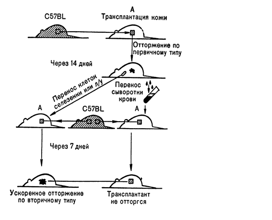 Схема воспроизведения адоптивного иммунитета к кожному трансплантату приведена на рисунке 12-9.