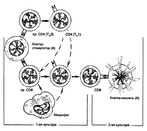 Реакция развивается при взаимодействии генетически различающихся (аллогенных) лимфоцитов. Результат реакции состоит в накоплении цитотоксических Т-лимфоцитов (CD8+ Т-клеток), специфичных к антигенам гистосовместимости клеток-стимуляторов. В первичной культуре предшественники ЦТЛ (пр. CD8), представленные в суммарной популяции анализируемых лимфоцитов, после распознавания аллоантигенов клеток-стимуляторов вступают в процесс пролиферации и дифференцировки в зрелые ЦТЛ (CD8). Интенсивность пролиферативной реакции оценивают по включению ЗH-mимuдuнa в размножающиеся клетки. Для созревания пр. CD8 необходима помощь со стороны макрофагов и хелперных CD4+ Т-клеток (Тн1), образующихся из антигенраспознающих предшественников (ТнО). Оценку накопившихся в первичной культуре CD8+ Т-клеток проводят по вторичной культуре. В качестве мишеней используют те аллогенные клетки, которые в первичной культуре выступали стимуляторами.