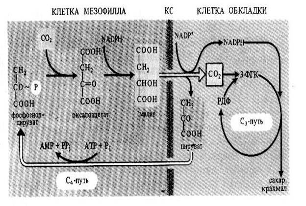 Для листьев С4-растений характерно анатомическое строение кранц-типа. Проводящие пучки у таких растений окружены двумя слоями зеленых клеток ассимиляционной паренхимы. Внешний слой образуют клетки-мезофилла, а внутренний слой составляют клетки-обкладки сосудистого пучка, которые также содержат хлоропласты. Клетки мезофилла и обкладки отличаются структурно и функционально. Хлоропласты клеток обкладки содержат много зерен крахмала и не имеют гран. В клетках мезофилла хлоропласты имеют обычную структуру. В клетках мезофилла происходит присоединение углекислого газа к ФЕП с образованием оксалоацетата, который далее восстанавливается до малата. Далее малат или аспартат транспортируются в клетки обкладки, где декарбоксилируются с образованием пирувата (С3-кислота). После этого С3-кислоты возвращаются в клетки обкладки (превращаются в первичный акцептор СО2), а углекислота попадает в цикл Кальвина.