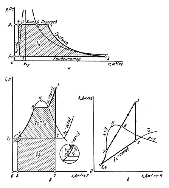 Точка 4 соответствует состоянию рабочего тела перед паровым котлом. В котле происходят: нагрев жидкости (4— 5), парообразование (5— 6) и перегрев пара (6 —1). Теплота