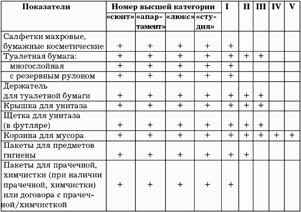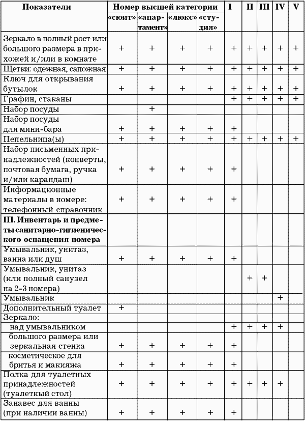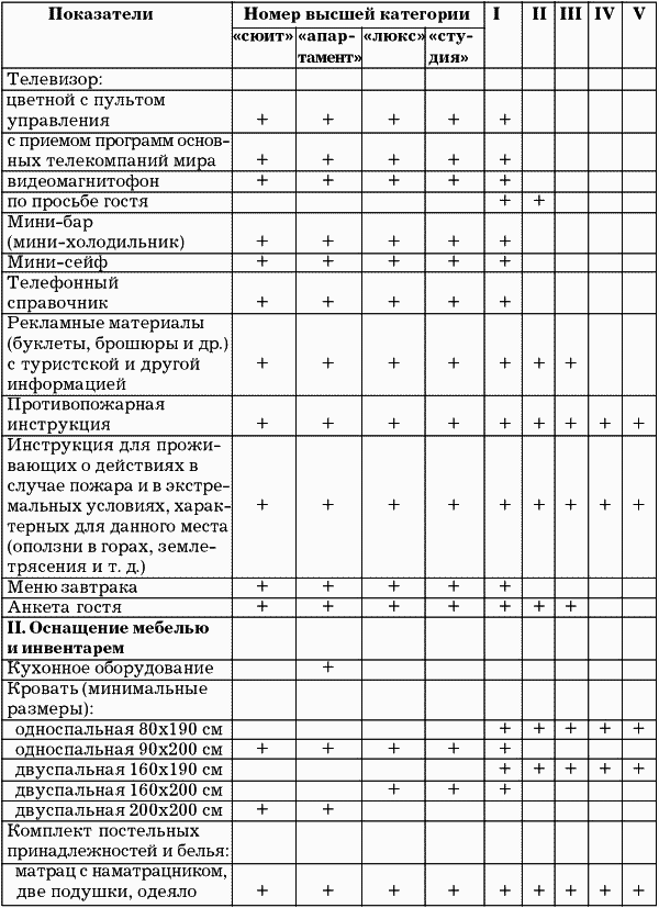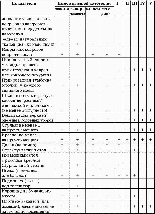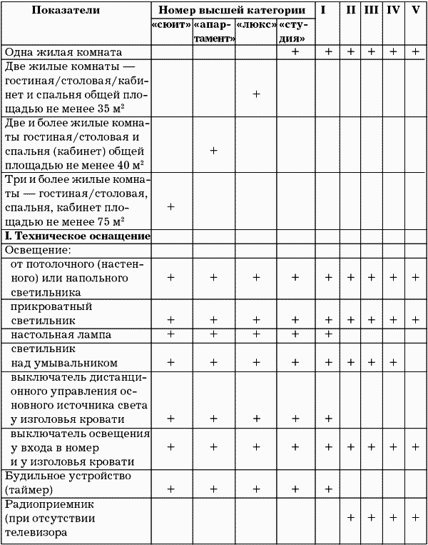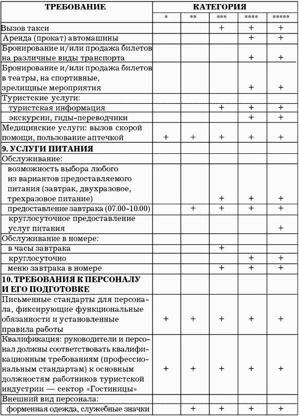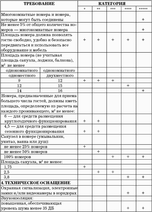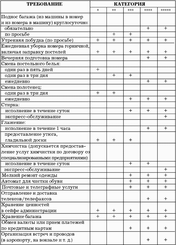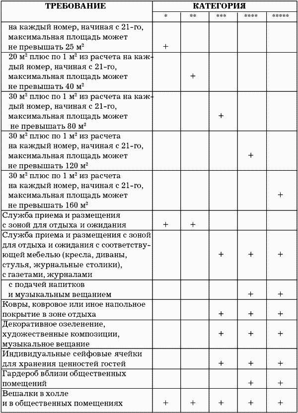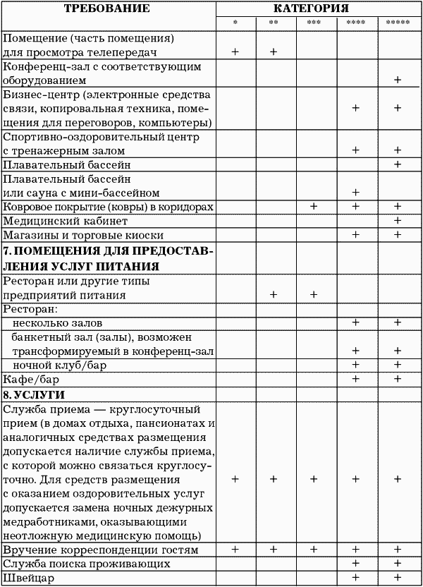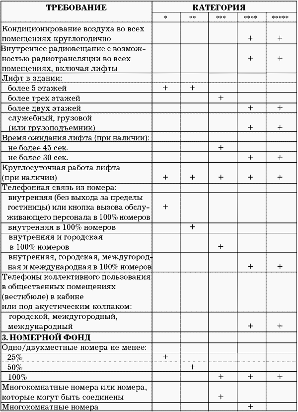Таблица 1 Требования к гостиницам и другим средствам размещения различных категорий