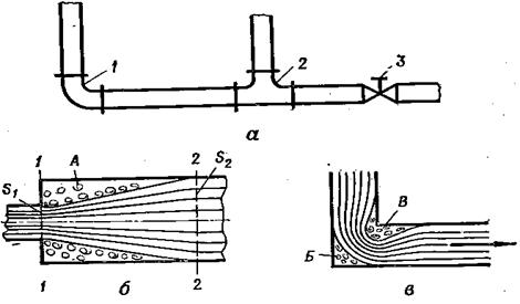 а – схема трубопровода; б – внезапное расширение жидкости; в – колено без закруглений; 1 – колено; 2 – тройник; 3 – вентиль