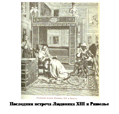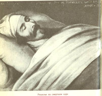 В богато меблированной обширной комнате трое: справа от нас – Людовик XIII в королевском наряде. Напротив короля в глубоком кресле, согбенный, беспомощный старик в кардинальской мантии. Это Ришелье. За его креслом – племянница кардинала, герцогиня д’Эгийон со слезами на глазах. Она удручена горем. Левая ее рука положена на верхнюю часть кресла, правая - в ней платок – приложена ко рту. король правой рукой поддерживает подбородок и внимательно слушает своего первого министра. Ришелье вытянул ноги, прикрытые мантией, правой рукой опершись о поручни кресла, с трудом что говорит своему владыке, подкрепляя весомость своих слов беспомощным жестом почти бессильной левой руки. Голова наклонена вперед, рот полуоткрыт – слова Ришелье даются с немалым трудом. Он явно утомлен. Людовик XIII это замечает. Через час он оставляет Ришелье со своей племянницей. Он просит ее оставить его. Место д’Эгийон занимает отец Леон, дающий умирающему последнее отпущение грехов. «Предаюсь, Господи, в руки твои», - шепчет Ришелье. Через секунду-другую он вздрагивает и затихает. Отец Леон подносит к его рту зажженную свечу, но пламя остается неподвижным, всемогущий кардинал мертв. Смерть наступила 4 декабря 1642 г.