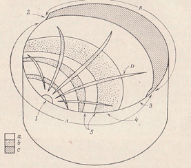 Рис. 19 Особенности поверхности разрушения пластичного металла в результате действия знакопеременных циклических нагрузок. 1 — начало О; 2— область среза; 3— гладкая поверхность; 4— шероховатая поверхность; 5 — участки различной текстуры, Е; D — радиальные усы; а — малая относительная скорость роста трещины; b — большая относительная скорость роста трещины; c— конечная стадия разрушения.