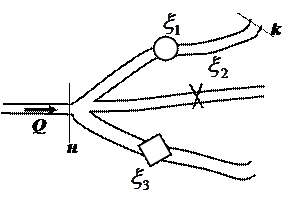 Разветвлённые трубопроводы отличаются тем, что они имеют одну общую точку, из которой расходятся разные потоки, или общую точку, в которой несколько разных потоков сходится. Этот вариант наиболее часто встречается в гидросистемах технологического оборудования, где от одной насосной станции питается сразу несколько одновременно работающих потребителей. Для разветвлённых трубопроводов, так же как и для параллельных, можно записать уравнение расходов