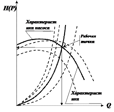 и характеристику насоса можно найти так называемую рабочую точку, как точку пересечения характеристик насоса и трубопровода. Это означает, что при соответствующих этой точке давлении и расходе, будет обеспечиваться работа насоса с требуемыми характеристиками. Чтобы получить другую рабочую точку нужно или изменить рабочую характеристику насоса или характеристику трубопровода. Это можно сделать различными способами, например, изменив сопротивление трубопровода или режим работы насоса.