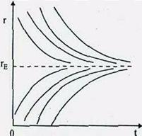 Как видим, решение (12) уравнения (9) при любом начальном значении r0 асимптотически стремится к r E при неограниченном росте t, что и означает установление в конце концов равновесия между капиталовложениями и сбережениями (рис. 2).