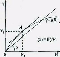 Условие (19) выполняется в точке А на рис. 5, которой соответствует уровень занятости N и объем выпуска продукции Y. Как видим, в точке А касательная к графику производственной функции параллельна прямой