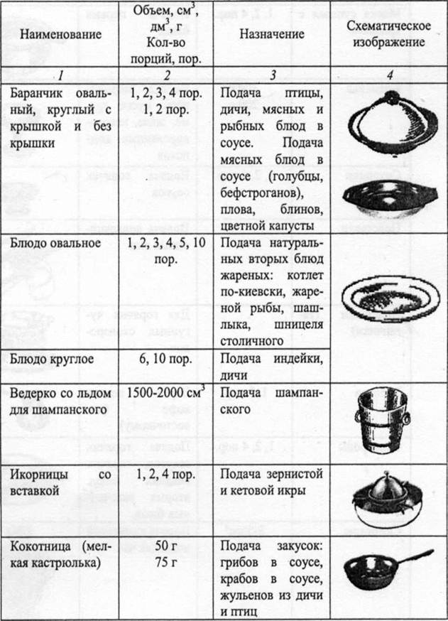 На предприятиях, стилизованных под старину и специализирующихся на приготовлении блюд национальной кухни, применяют деревянную посуду: хлебницы для подачи хлеба, пирогов; соусники, приборы для специй; тарелки и блюда для холодных блюд и закусок, десерта, фруктов; кружки для напитков собственного производства; бокалы для прохладительных напитков; ложки столовые и разливательные.