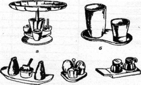Рисунок 4. Посуда из различных пластмасс: а — ваза из полистирола с приборами для специй; б — салфетницы из полистирола; в — приборы для специй из полистирола и аминопласта
