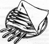 Для этого сначала на столы раскладывают отглаженные и свернутые вчетверо скатерти, затем их разворачивают каждую и располагают вдоль длины стола (рис. 7, а). Двумя руками берут за кромки одной стороны (рис. 7, б); скатерть резким движением поднимают над столом (осторожно за кромку, чтобы не помять), как бы встряхивая, и тут же резко опуская вниз, чтобы образовалась воздушная подушка между скатертью и столом (рис. 7, в). Заглаженная центральная складка скатерти должна лечь по оси стола (рис. 7, д).