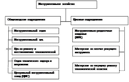 Состав инструментального хозяйства и схема управления им определяется типом основного производства и объемами выпуска. Типовая структура инструментального хозяйства предприятия состоит из общезаводских и цеховых подразделений.