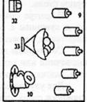 Рисунок 32. Схема организации рабочего места бармена при приеме коктейль: 1 - рюмка мартини; 2 - рюмка Маргарита; 3 - стакан олд-фэшенд; 4 - стакан шот; 5 - рюмка для крепких напитков; 6 - рюмка для вина; 7 - бокал для шампанского; 8 - фужер; 9 - напитки в бутылках; 10 - кувшин с соком; 11 - шейкер; 12 - джиггер в стакане с водой; 13 - кулер со льдом и щипцами; 14 - боуль с разливательной ложкой и чашками; 15-маленький поднос для подачи напитков; 16-барная ложка; 17 - барный нож; 18 - нож сомелье; 19 - ручник; 20 -стакан с соломинками; 21 — цветы; 22 — вазочка с орешками; 23 — за-вочка с маслинами; 24 — вазочка с оливками; 25 — стопка с двухрожко-выми шпажками; 26 — шоколадный набор в коробке; 27 — лотки с лимоном и двухрожковыми вилками; 28 — солонка; 29 — сигаретница; 30 — пепельница; 31 — канделябр со свечами; 32 — соковыжималка; 33 — ваза с полотняной салфеткой и цитрусовыми