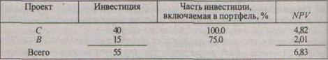 Можно проверить, что любая другая комбинация ухудшает результаты — уменьшает суммарный NPV. В частности, проверим вариант. когда проект С, как имеющий наивысший NPV, в полном объеме включается в инвестиционный проект: