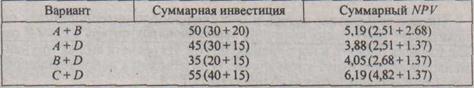 Возможны следующие сочетания проектов в портфеле: А + В, А + D,B + D,C + D. Рассчитаем суммарный NPV для каждого варианта: