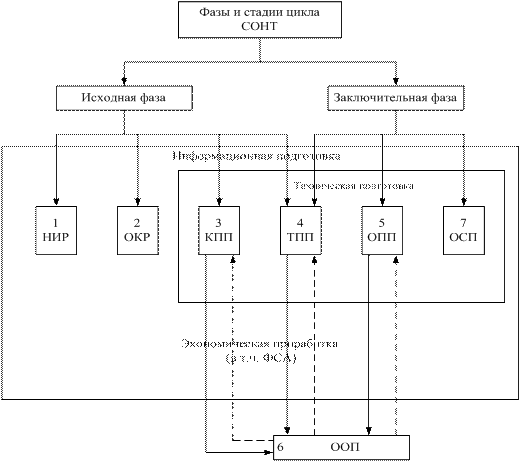 Условно стадии создания нового изделия, включая НИР, ОКР, КПП и частично ТПП, относятся к исходной фазе цикла СОНТ, а частично стадия ТПП и остальные стадии ОПП, ООП и ОСП относятся к заключительной фазе.