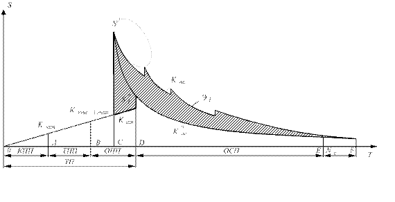 При неправильно организованном и спланированном выполнении подготовки производства имеет место преждевременное начало освоения (в точке С), когда подготовка еще полностью не завершена, оснащение и специальное оборудование готовы частично, а стадии КПП и ТПП выполнены недостаточно качественно, что ведет к периодическому внесению в чертежи, карты технологических процессов и другую документацию необходимых конструкторско-технологических изменений. В результате начальная себестоимость